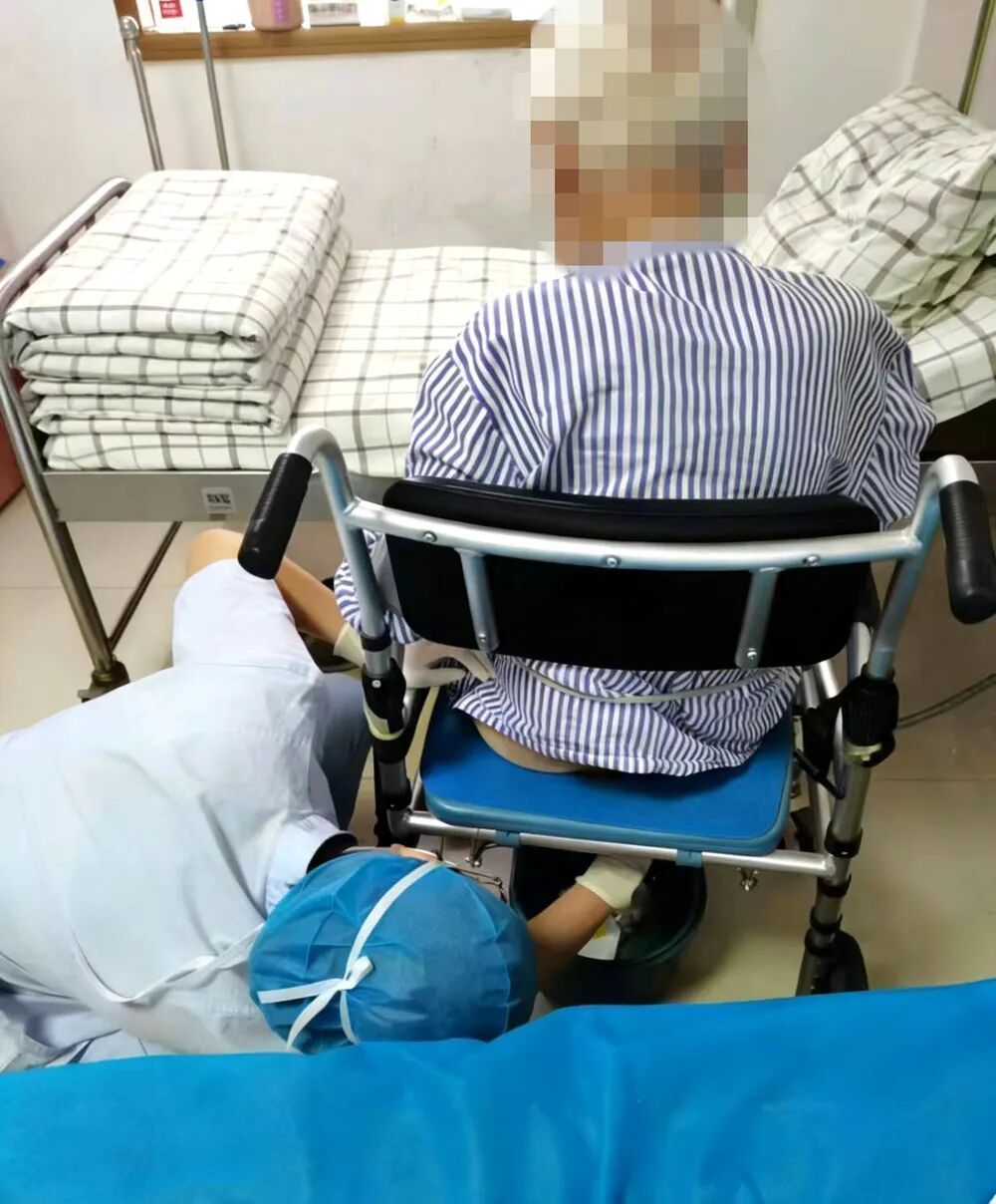 某天中午,科室里一位老年患者因卧床时间长,数天未解大便,尝试了开塞露,效果不理想,坐在马桶椅上腹部胀痛难忍。家属在一旁急得团团转,看着患者痛苦的神情,黄丽娟医生没有丝毫迟疑,戴上手套、做好防护,俯身用手一点点为患者清理干结的粪便。过程中,患者满脸愧疚与尴尬,她轻声安抚,告诉这只是医生的分内之事。当堵塞的粪便被顺利清理,患者紧锁的眉头舒展,连声道谢时。医者的责任从来不止于开方用药,更在于用最直接、最温暖的方式,为患者解除身心的煎熬。